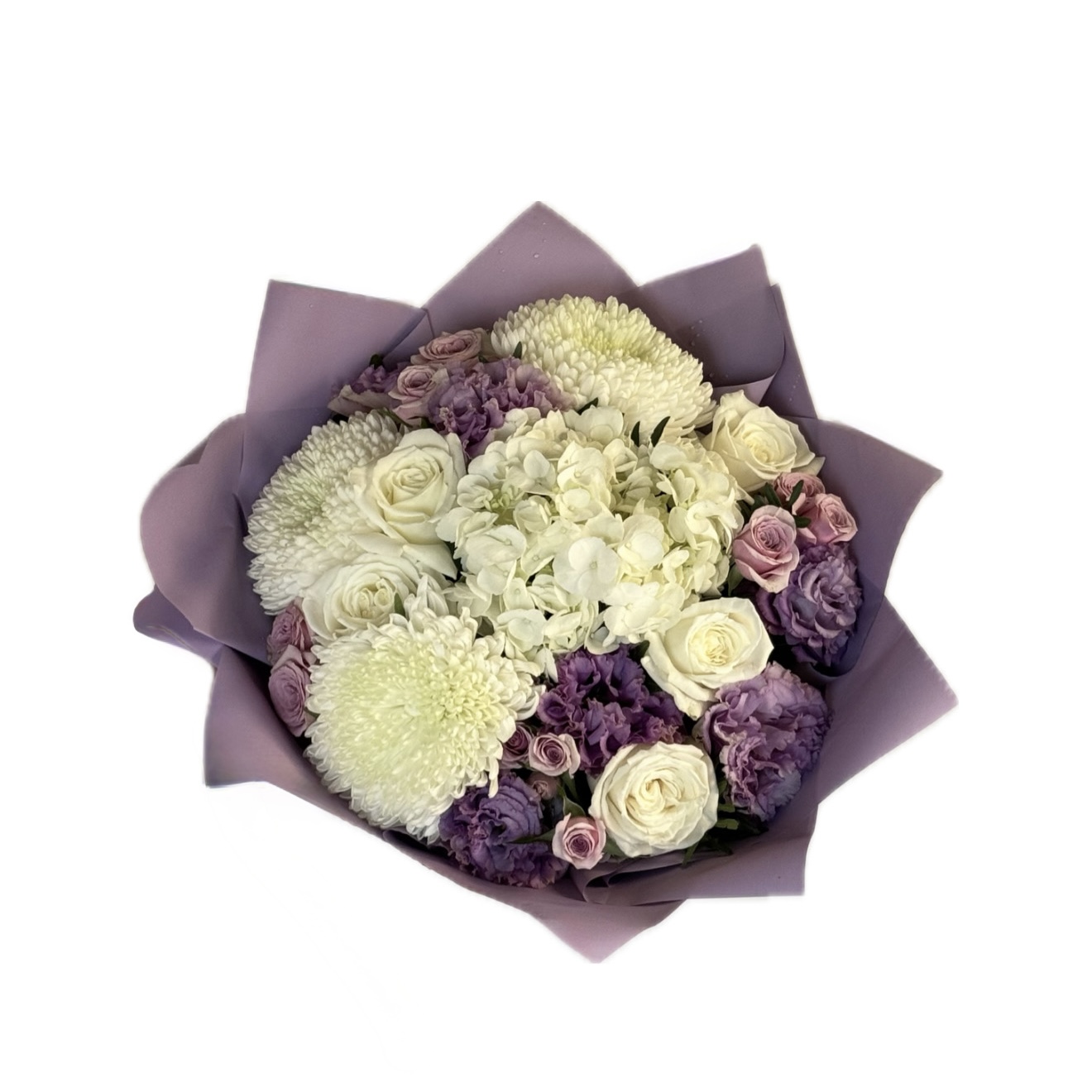 Hydrangea 1 stem, chrysantemum 3 stem, rose 5 stem, spray rose 3 stem, lisianthus 1 stem.