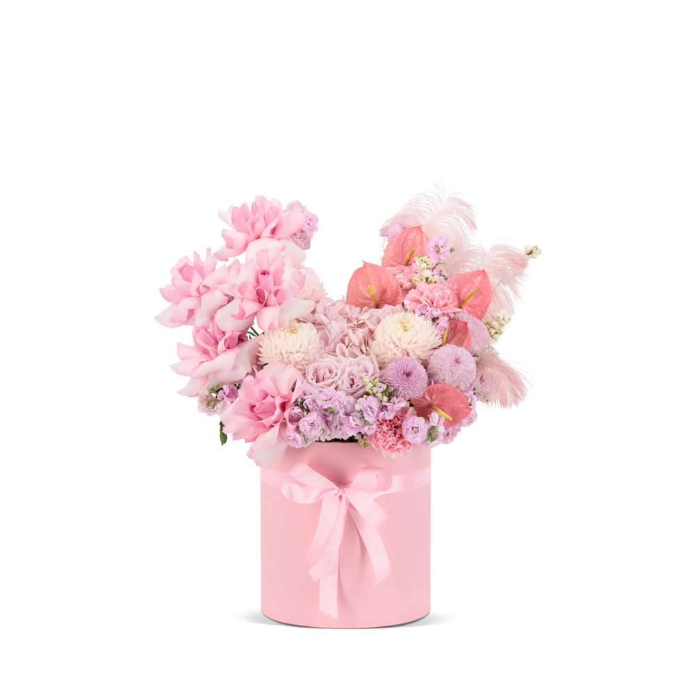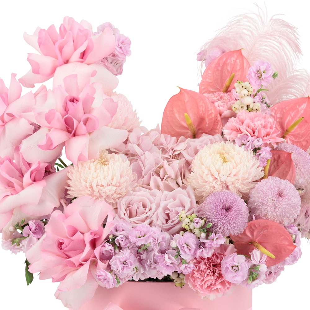 Roses 7 stem, hydrangea 1 stem, chrysantemus 6 stem, anthurium 5 stem, mathiola 6 stem, pink hatbox 1.