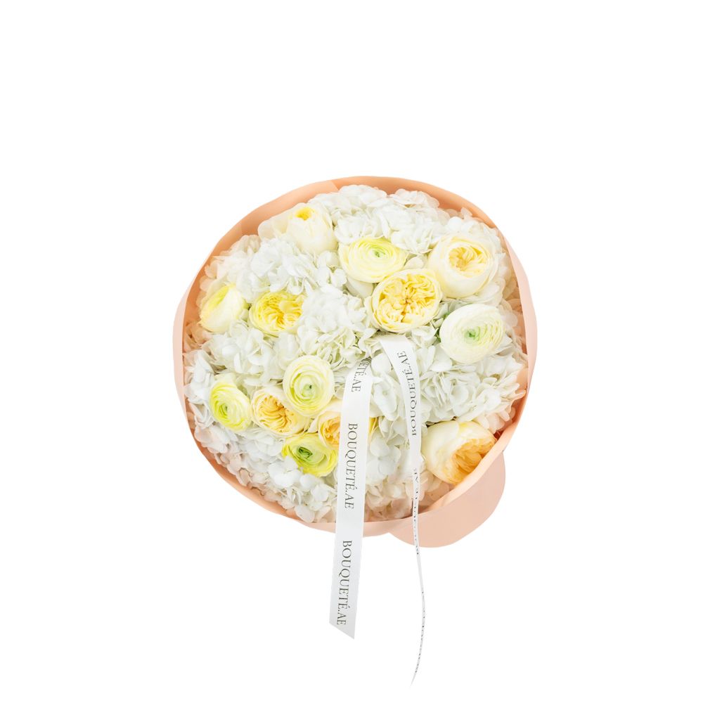 Hydrangea 7 stems, ranunculus 5 stems, rose 7 stems.